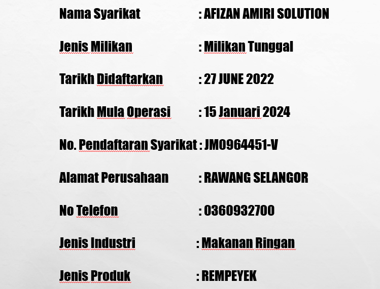 AFIZAN AMIRI SOLUTION ditubuhkan pada tahun 27 JUNE 2022 . Aktiviti utama syarikat ialah pengeluaran snek tradisional melayu dengan skala pengeluaran di tahap sederhana . Produk utama syarikat adalah ‘REMPEYEK iaitu sejenis kuih tradisional masyarakat Melayu . Selain itu , syarikat juga mengeluarkan produk “POPIAH SIMPUL SEDAP” untuk memenuhi pasaran tempatan . Syarikat juga , akan mengeluarkan pelbagai produk untuk memastikan permintaan pelanggan yang berbeza dapat dipenuhi untuk pasaran yang akan datang.