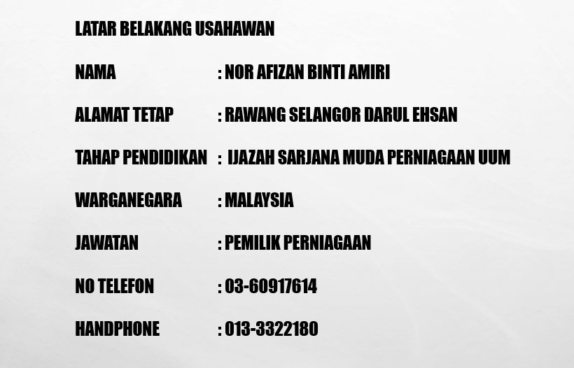Syarikat adalah milikan tunggal dimiliki oleh Cik Nor Afizan Binti Amiri. Walaupun syarikat ini baru ditubuhkan, namun kemahiran untuk mengeluarkan produk ini datangnya dari pengusaha sendiri yang menjalankan perniagaan dari rumah .